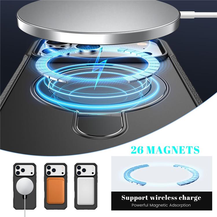 Med den inbyggda 360° roterande ställfunktionen kan du njuta av handsfree-videor, samtal eller möten både i stående och liggande läge. Skalet är dessutom helt kompatibelt med MagSafe och utrustat med starka magneter som även gör det enkelt att använda magnetiska bilfästen – en smidig lösning för säkrare körning. Lägg till militärklassat skydd och du har ett mobilskal som klarar tuffa situationer, samtidigt som det ser stilrent ut.