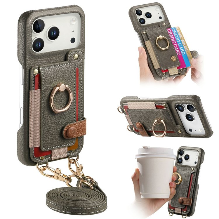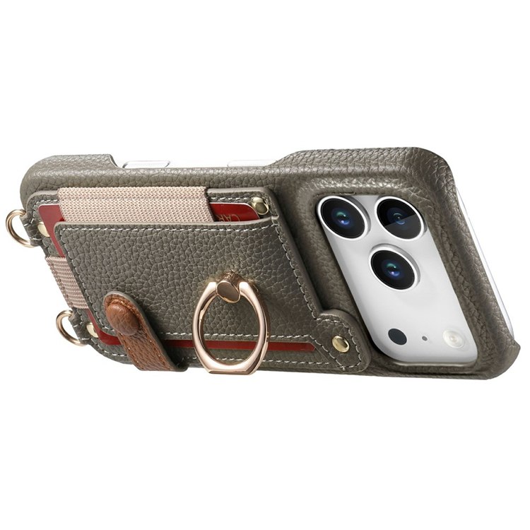 iPhone 17 Pro Mobilskal med Korthållare och Axelrem Ring Kickstand Läder - Grå