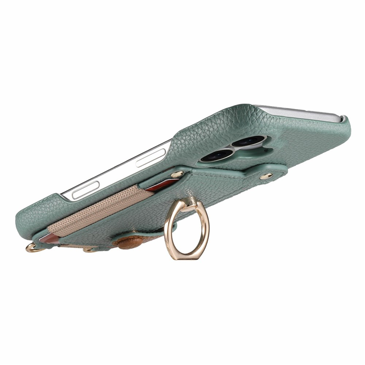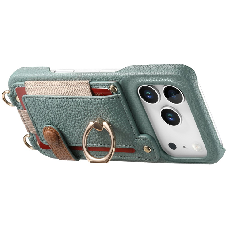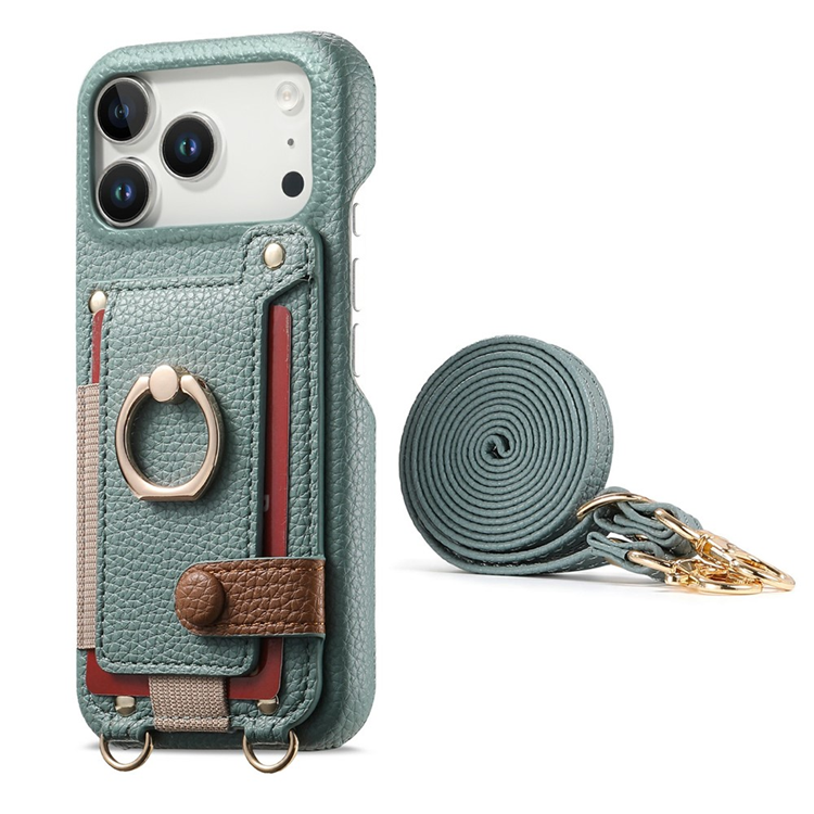 iPhone 17 Pro Mobilskal med Korthållare och Axelrem Ring Kickstand Läder - Sky Blå