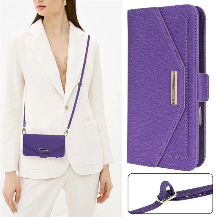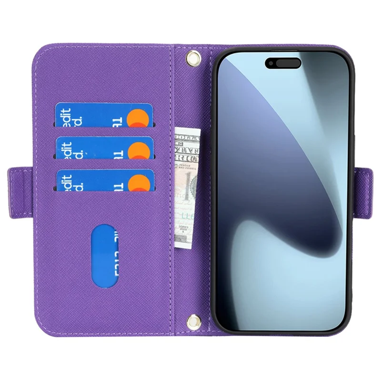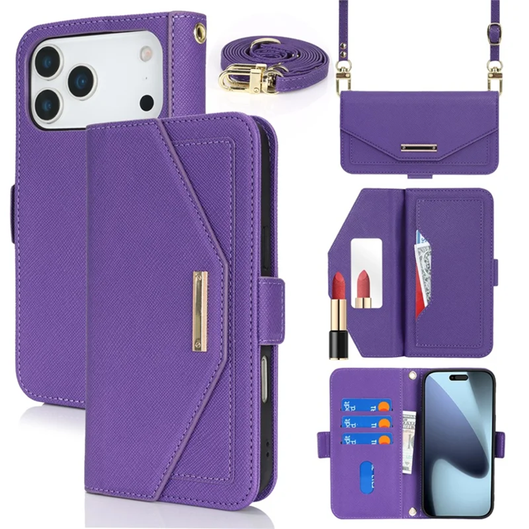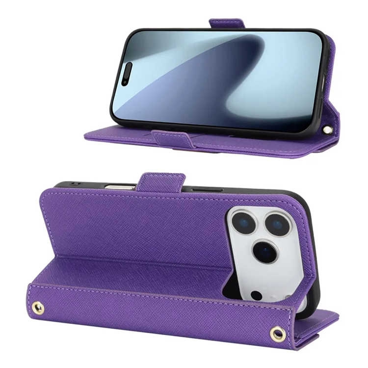 iPhone 17 Pro Plånboksfodral Cross Texture Stativ PU-läder med Axelrem/Sminkspegel - Lila