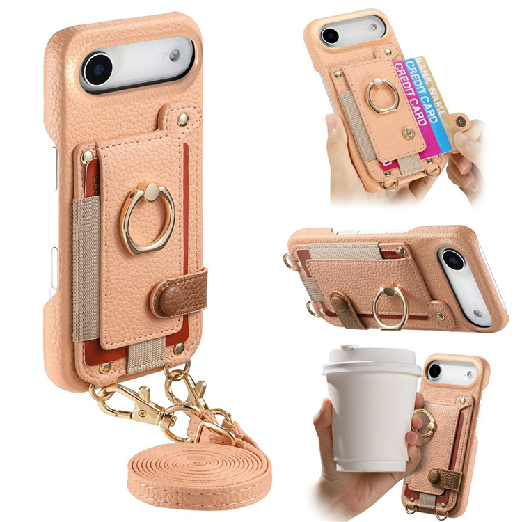 iPhone Air Mobilskal med Korthållare och Axelrem Ring Kickstand Läder + PC - Rosa