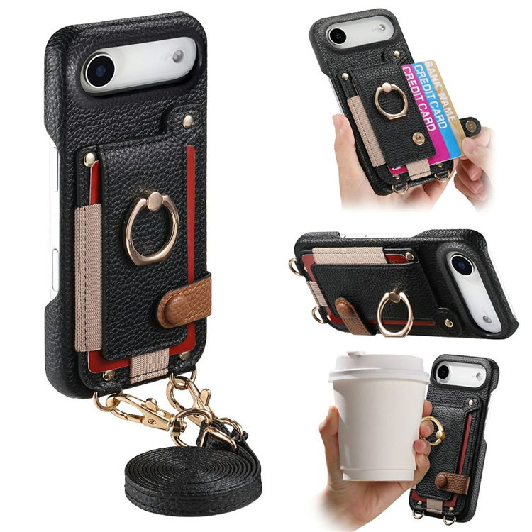 iPhone Air Mobilskal med Korthållare och Axelrem Ring Kickstand Läder + PC - Svart