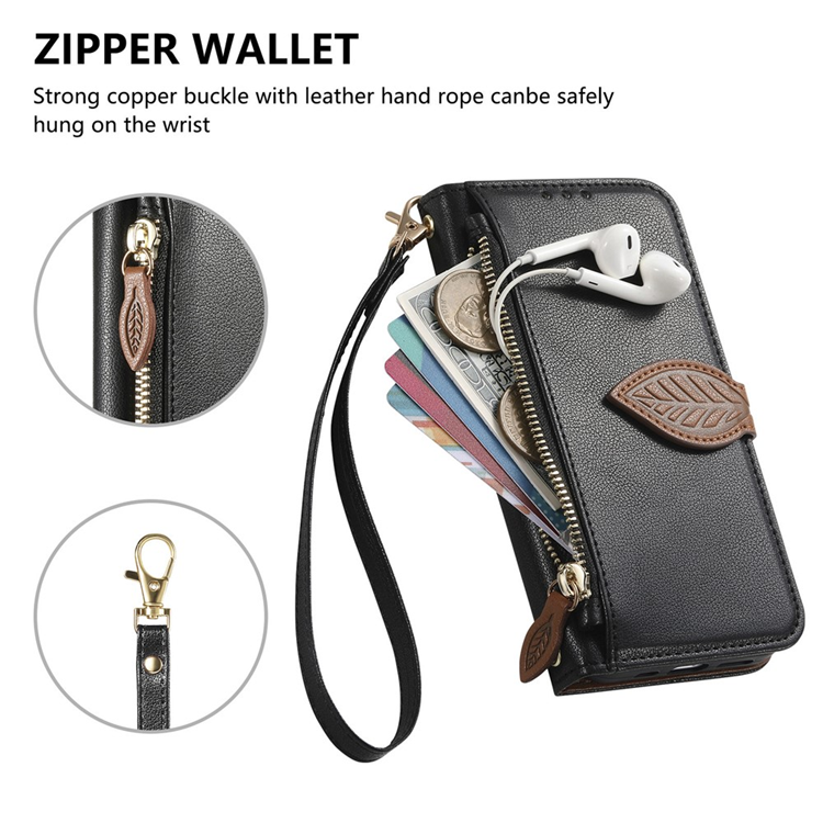 iPhone 17 Pro Max Plånboksfodral med Handrem Leaf Shape Magnetiskt Spänne Läder - Svart