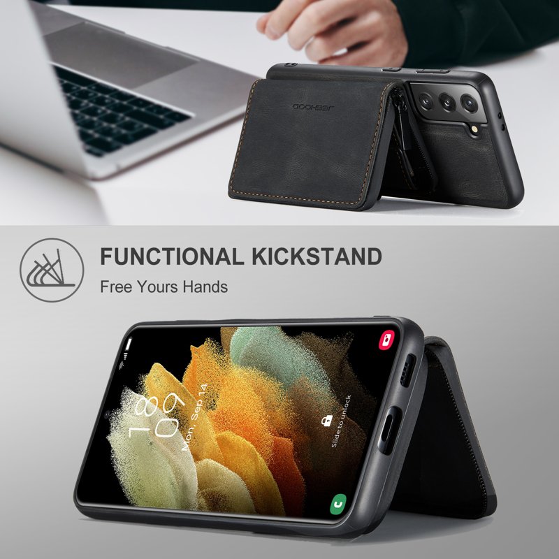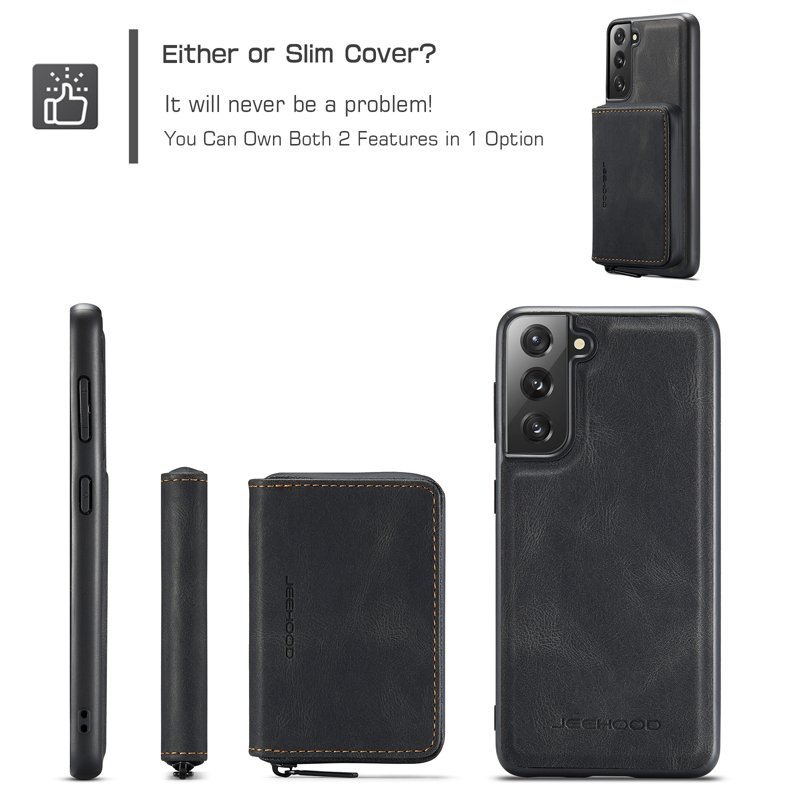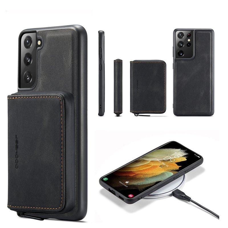 Detta mobilfodral kombinerar stil och funktionalitet. Med en läderplånbok som fästs magnetiskt kan du använda dem separat. Trots sin kompakta design har plånboken stor kapacitet med tre kortfack och två sedelfack. Fodralet är tillverkat av TPU och premium PU-läder, vilket gör det både elegant och hållbart. Trådlös laddning påverkas inte av fodralet.