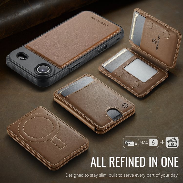 Skalet är tillverkat av PU-läder, TPU och PC-material för att ge långvarig hållbarhet, stötdämpning och vattenresistens. Med totalt 6 kortplatser (inklusive en fotoficka) får du gott om plats för kort och ID, samtidigt som det inbyggda stativet gör det enkelt att titta på filmer eller arbeta handsfree. Tack vare den integrerade magnetringen kan skalet fästas direkt på MagSafe-kompatibla skal och tillbehör, vilket gör det lika praktiskt som elegant.