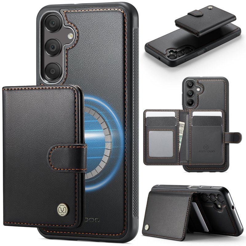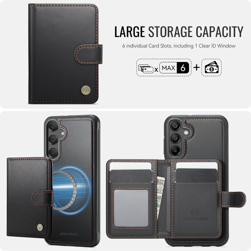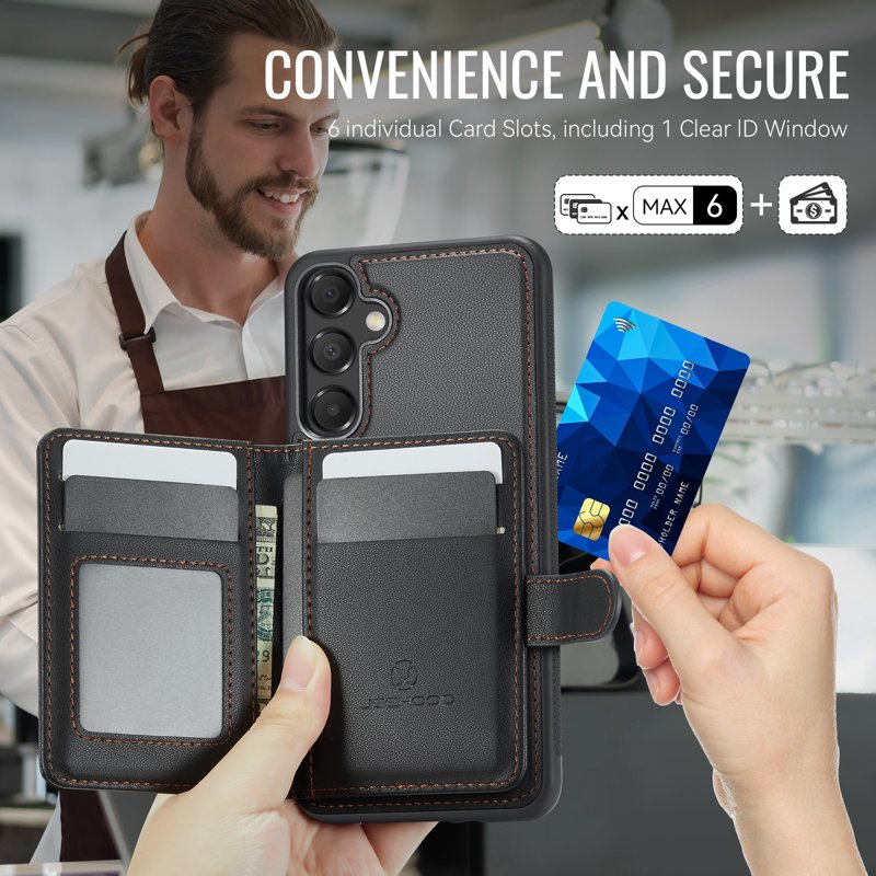 - Säker magnetisk spänne: Håller kort och kontanter på plats under användning.