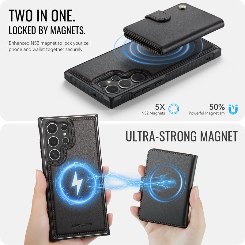 - Säker magnetisk spänne: Sidospännet ger extra säkerhet och håller dina kort och kontanter på plats under daglig användning.