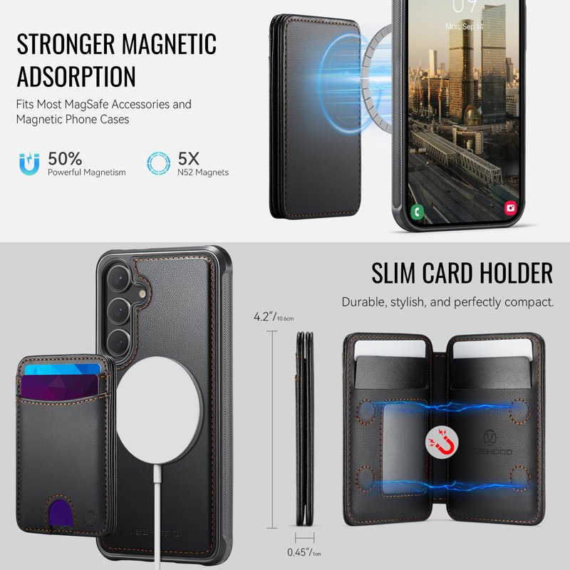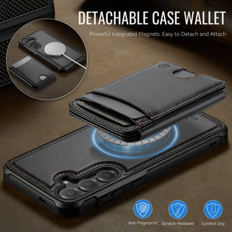 Skydda din Samsung Galaxy S26 med JEEHOOD J10 Leather Back Phone Cover. Denna magnetiska fodral kombinerar stil och funktionalitet. Med en avtagbar korthållare och kickstand får du både säkerhet och bekvämlighet i ett och samma paket. Perfekt för den moderna användaren som värdesätter både design och praktiska lösningar.