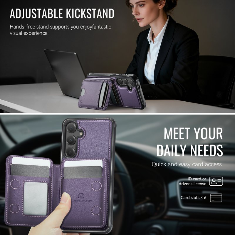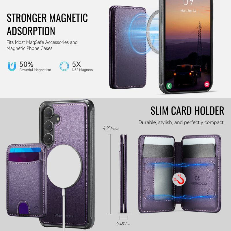 Skydda din Samsung Galaxy S26 Plus med JEEHOOD J10 Magnetic Case. Denna läderbakre telefonfodral erbjuder en praktisk lösning för att organisera dina kort och ge en stabil kickstand. Med sin eleganta design och funktionella egenskaper är detta fodral perfekt för både arbete och nöje.