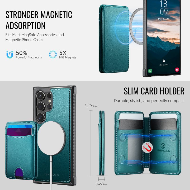 Skydda din Samsung Galaxy S26 Ultra med JEEHOOD J10 Magnetic Case. Denna läderbacka telefonfodral erbjuder en praktisk och stilren lösning för att organisera dina kort och ge dig en bekväm visningsupplevelse. Med sin smarta design och hållbara material är detta fodral perfekt för både arbete och nöje.