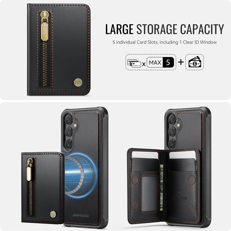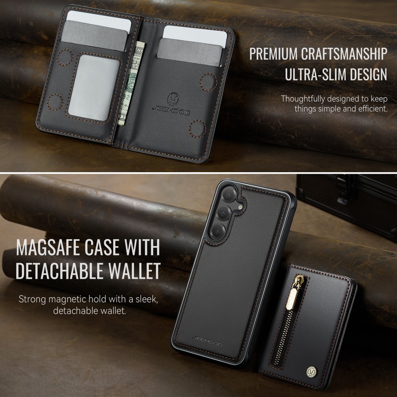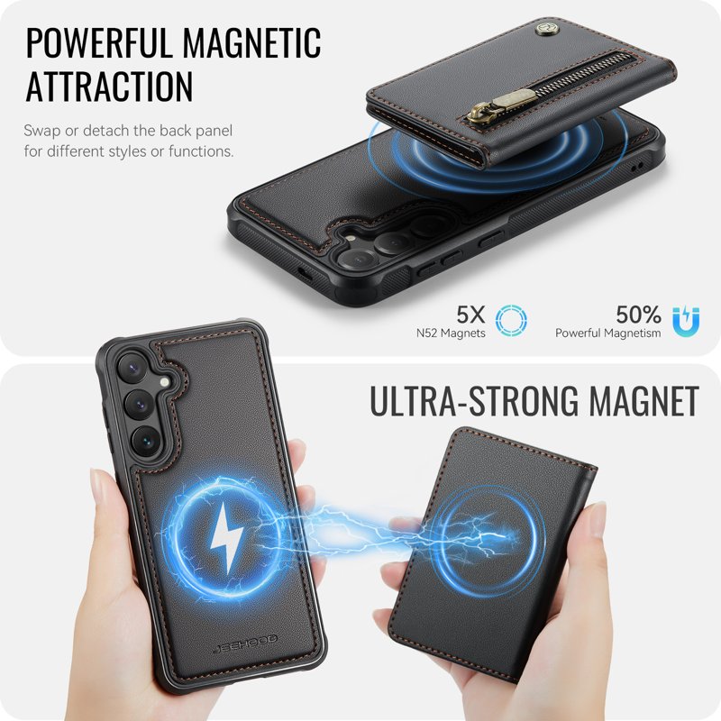 Skydda din Samsung Galaxy S26 Plus med JEEHOOD J12 Magnetic Detachable Zipper Wallet Kickstand Leather Back Cover. Denna praktiska och stiliga lösning erbjuder både skydd och funktionalitet. Med sin avtagbara design och smarta förvaringslösningar är den perfekt för den moderna användaren.