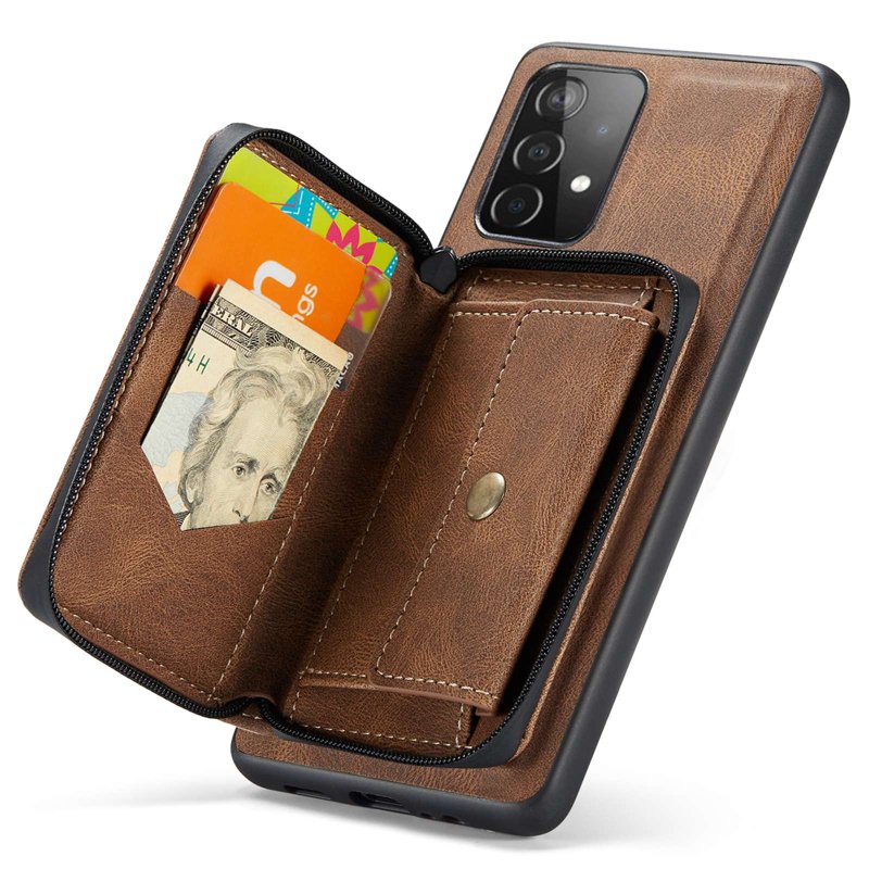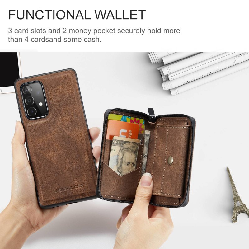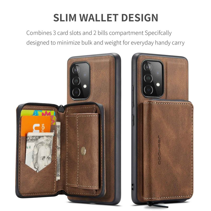 Detta mobilfodral kombinerar stil och funktionalitet. Med en läderplånbok som fästs magnetiskt kan du använda dem separat. Trots sin kompakta storlek har plånboken plats för tre kort och två sedlar. Fodralet är både chic och hållbart, tillverkat av TPU och PU-läder. Trådlös laddning påverkas inte av fodralet.