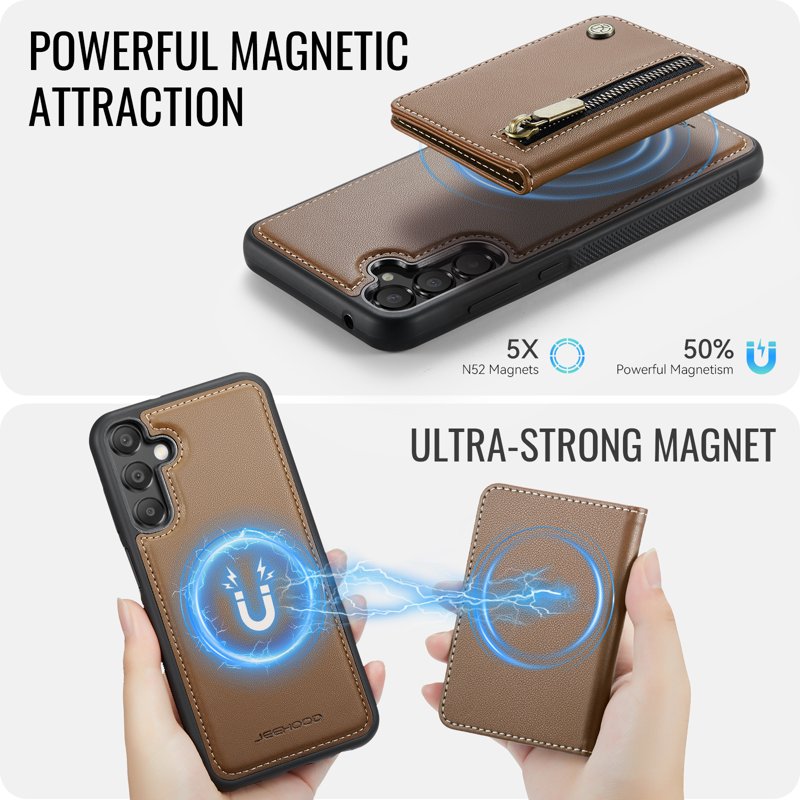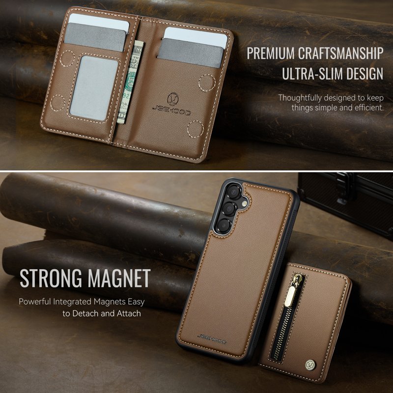 Skydda din Samsung Galaxy A55 5G med JEEHOOD J12 Magnetic Detachable Zipper Wallet Kickstand Leather Back Cover. Denna bruna plånboksfodral kombinerar stil och funktionalitet. Med sin avtagbara design och smarta förvaringslösningar är den perfekt för den moderna användaren.