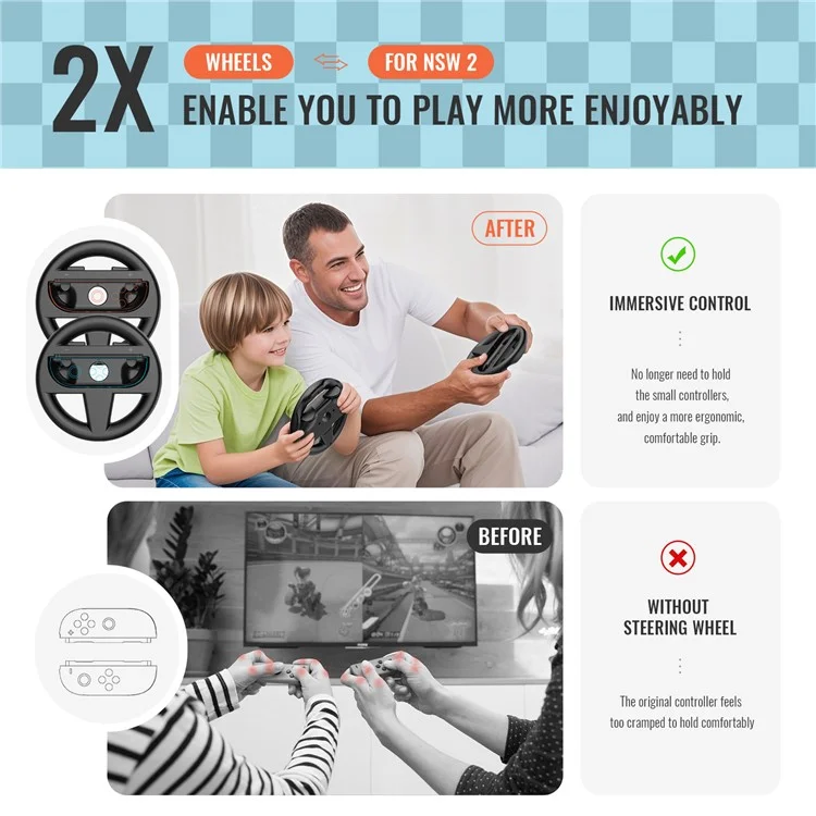 Tack vare sin ergonomiska design ligger rattarna skönt i händerna, med enkel montering av Joy-Cons som sitter säkert på plats. Den autentiska rattkänslan och responsiva kontrollen ger ett verklighetstroget grepp om spelet, samtidigt som den kompakta storleken gör dem perfekta att ta med överallt – från soffan till semesterresan. Med två rattar i paketet kan du och en vän njuta av spänningen tillsammans.