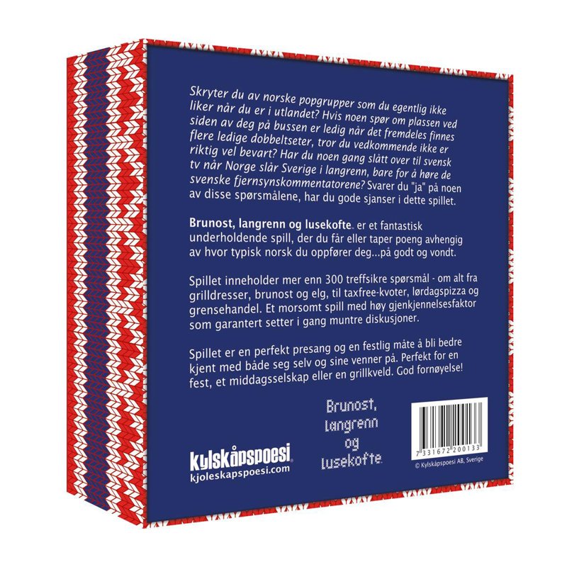 Det här underhållande kortspelet, Brunost, Langrenn Og Lusekofte, utmanar spelarna att vinna eller förlora poäng baserat på hur typiskt norskt deras beteende är, på gott och ont. Med över 300 välformulerade frågor är det perfekt för fester, middagssammankomster eller grillkvällar. Oavsett om du skryter om norska popgrupper som du faktiskt inte gillar när du är utomlands, eller ifrågasätter förnuftet hos någon som ber om att sitta bredvid dig på en buss med massor av tomma platser, fångar detta spel kärnan i norsk kultur på ett humoristiskt sätt.