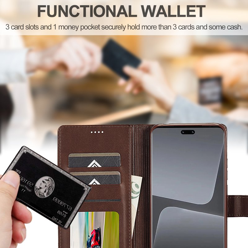 • Magnetisk Stängning: Med en stark magnetlås säkerställs att din telefon, pengar och kort förvaras säkert.