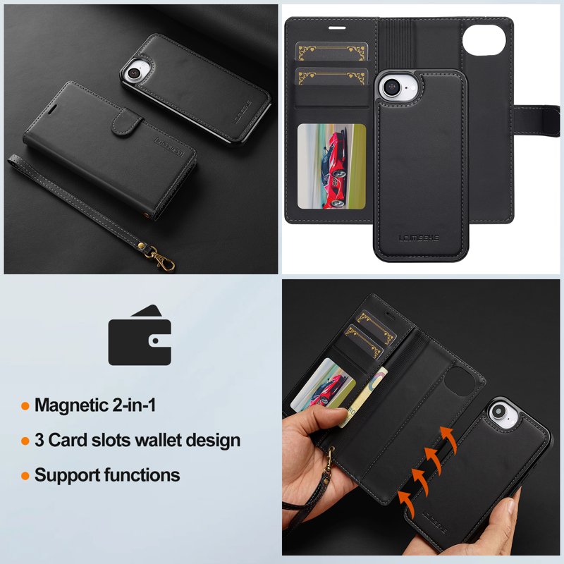Upptäck LC.IMEEKE L2 Series iPhone 16e Fodral i PU Läder - Svart. Detta fodral kombinerar stil och funktionalitet. Det erbjuder ett elegant skydd för din iPhone samtidigt som det har praktiska funktioner som en inbyggd plånbok och en avtagbar design. Perfekt för den moderna användaren som vill ha både säkerhet och bekvämlighet.