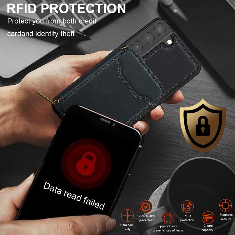 • RFID-skydd - Inbyggd RFID-blockering skyddar dina kreditkort och ID från obehörig avläsning.