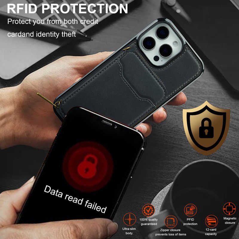 - RFID-skydd - Inbyggd RFID-blockering skyddar dina kreditkort och ID från obehörig avläsning.