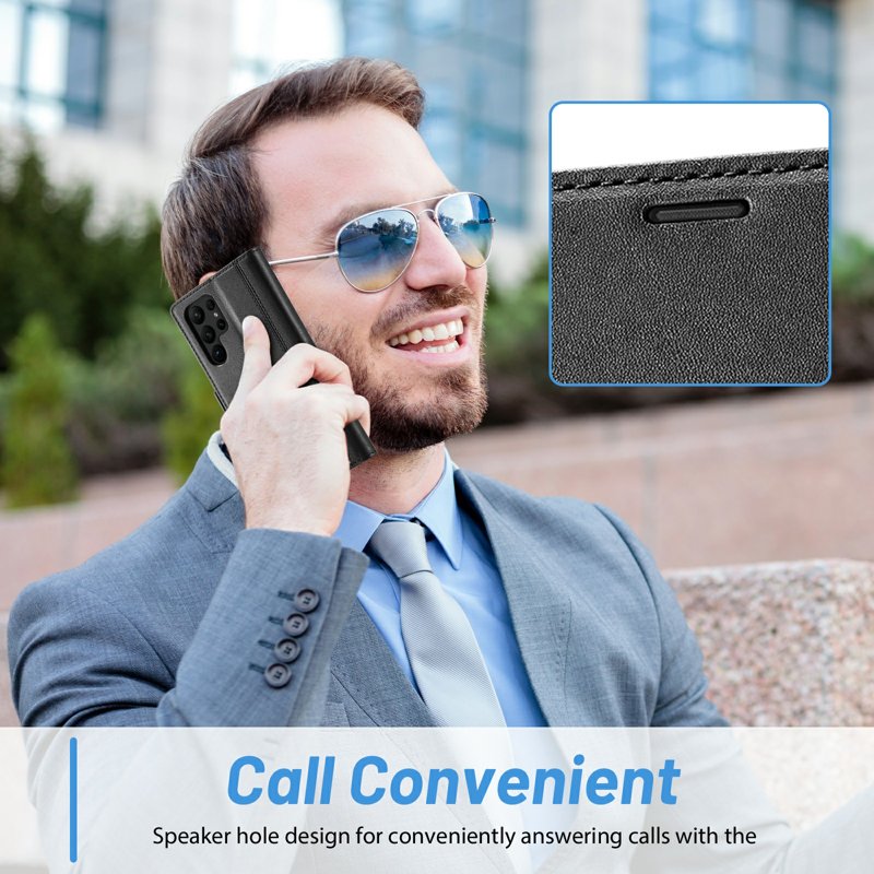 Detta fodral är designat för Samsung Galaxy S24 Ultra och tillverkat av högkvalitativt PU-läder och TPU. Det är slitstarkt och hållbart för långvarig användning. Med tre kortfack och en sedelplats kan du enkelt organisera dina tillhörigheter. De magnetiska dubbelspännena skyddar din telefon, kort och kontanter.