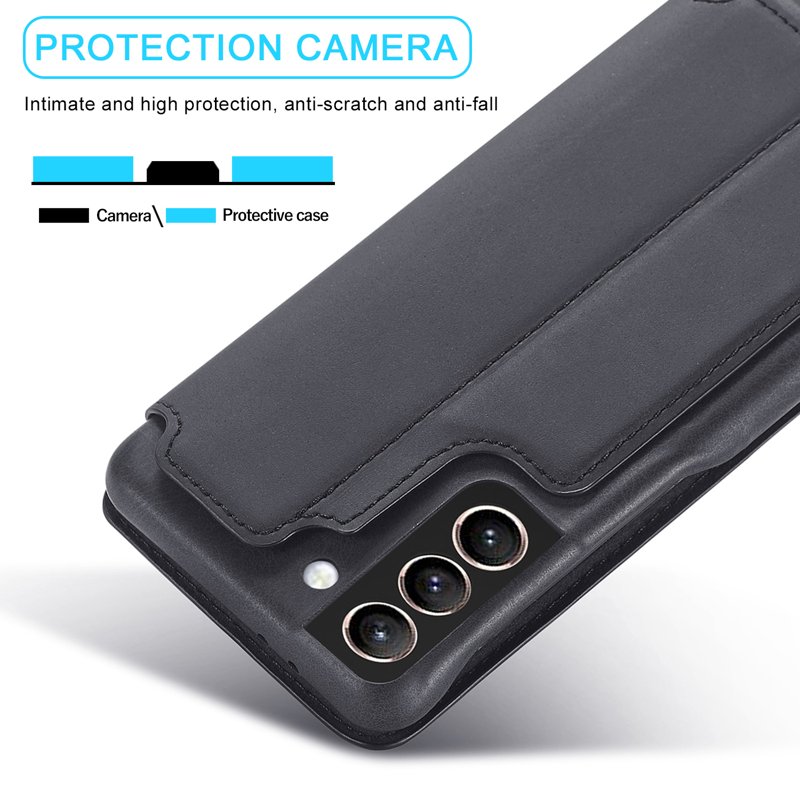 Skydda din Samsung Galaxy S21 med LC.IMEEKE fodral i äkta läder. Detta stiliga fodral kombinerar retrodesign med funktionalitet. Med en kortplats och en vikbar ställning erbjuder det både elegans och bekvämlighet. Perfekt för den moderna användaren som vill ha både skydd och stil.