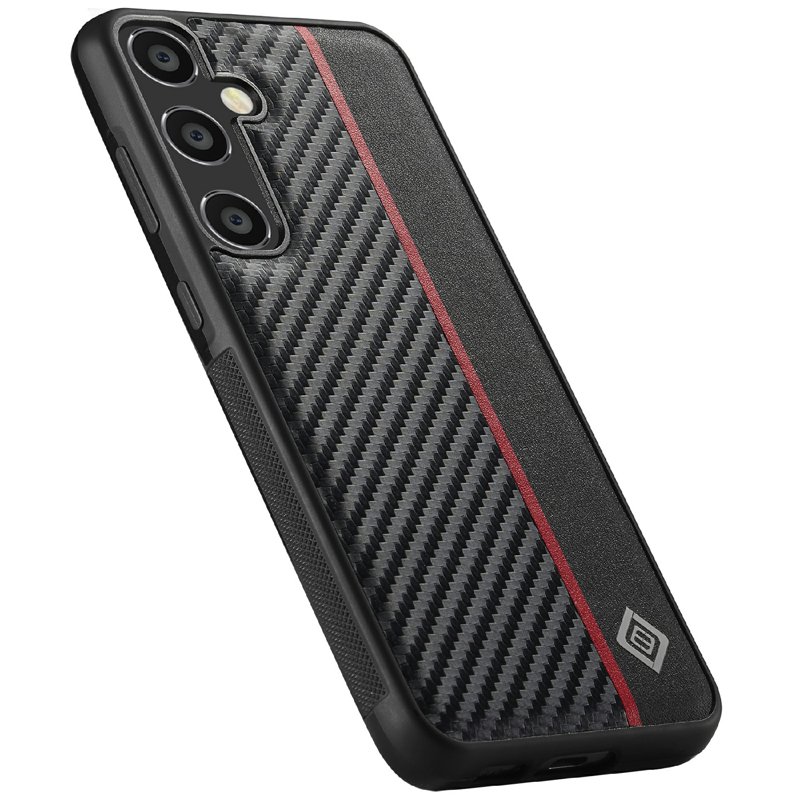 - Kolfiber PU Läder med Röd Rand: Snygg kolfiber PU-läder kombinerat med fintexturerad PU-läder och en iögonfallande röd vertikal rand för en modern och stilren look.