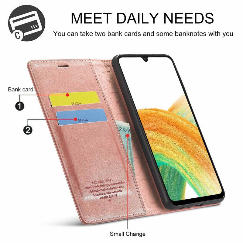 LC.IMEEKE Wallet Fodral för Samsung Galaxy A33 5G är den perfekta lösningen för att skydda din telefon. Med ett stilrent och hållbart PU-läder och en flexibel TPU-inre del, erbjuder detta fodral både säkerhet och funktionalitet. Det kombinerar plånbok och mobilfodral i ett praktiskt format, vilket gör det enkelt att hantera dina värdesaker.