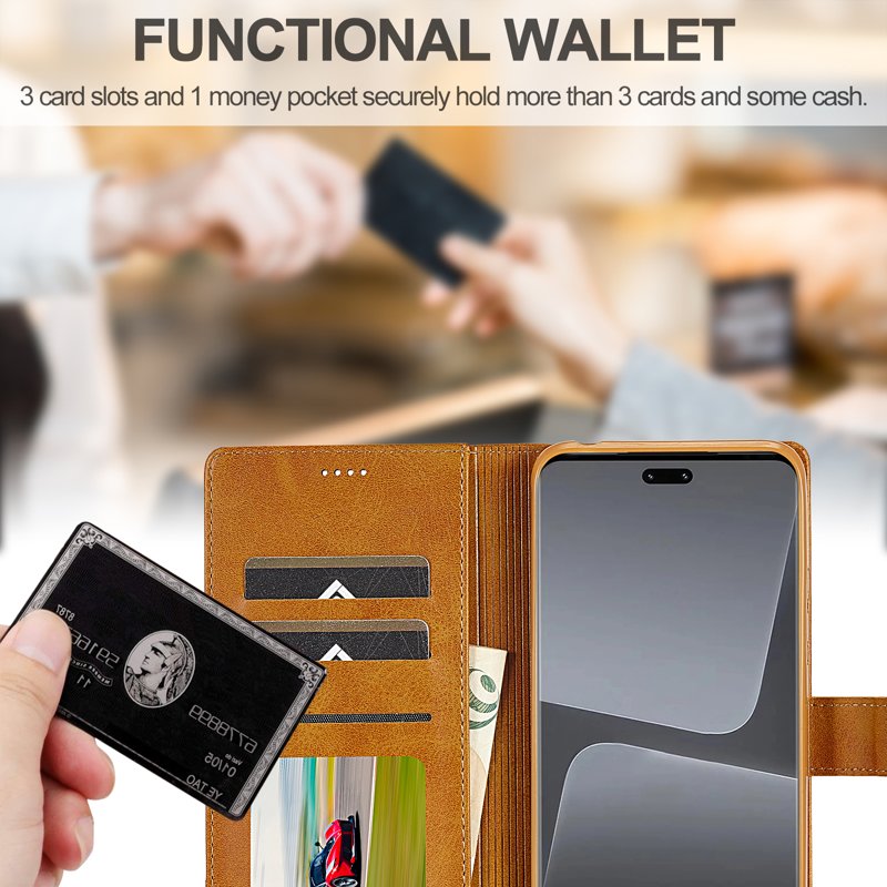 - Magnetisk Stängningsklämma: Med en stark magnetklämma för säker förvaring av telefon, pengar och kort.