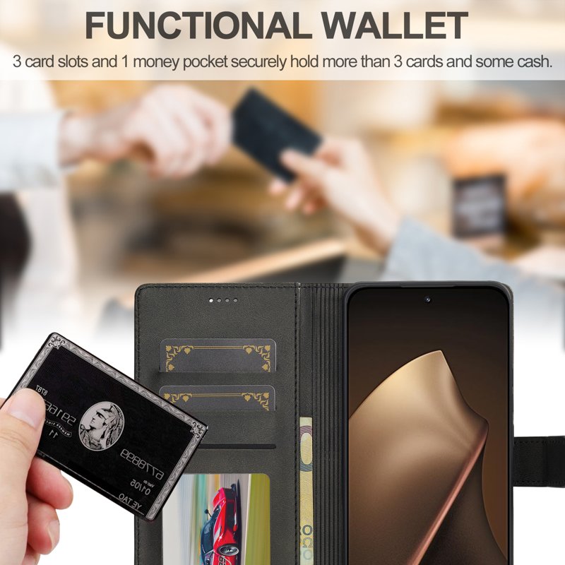 • Magnetisk Stängningsklämma: Med en stark magnetklämma för säker förvaring av telefon, pengar och kort.