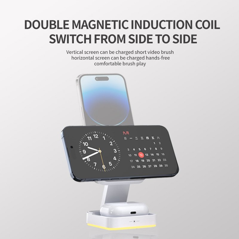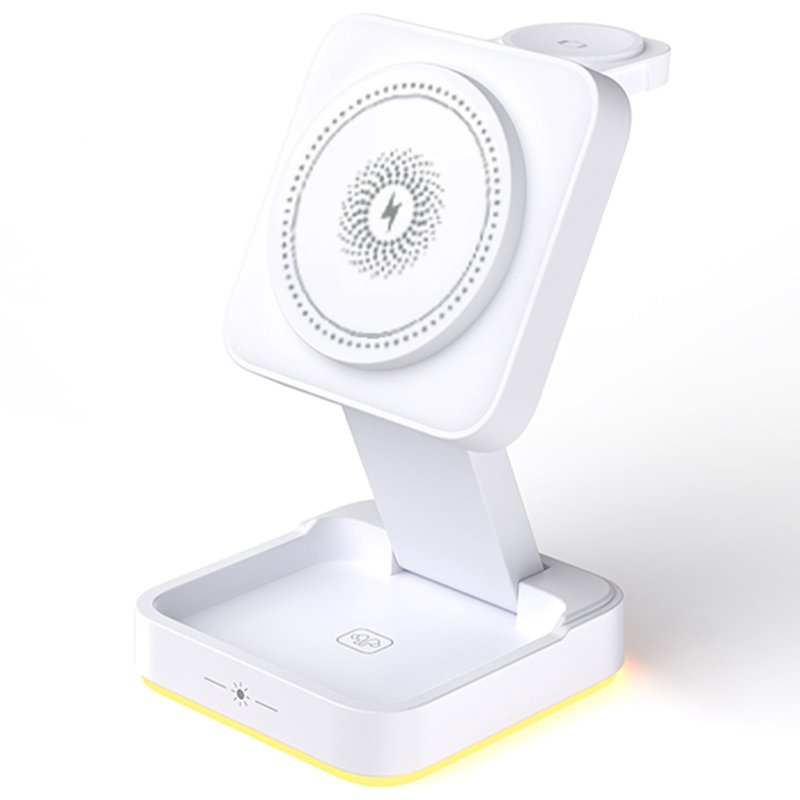 Denna 3-i-1 trådlösa laddare är den perfekta lösningen för att ladda din mobiltelefon, hörlurar och klocka samtidigt. Med en kraftfull magnetisk attraktion och en mjuk nattlampa är den både funktionell och praktisk. Den kompakta designen gör den lätt att förvara och ta med sig.