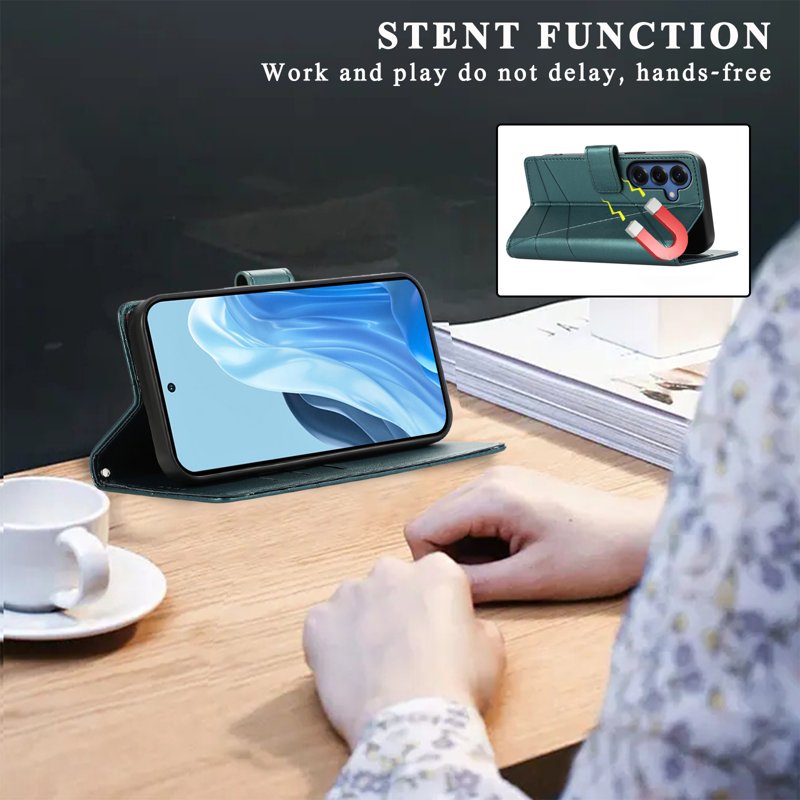 Skydda din Samsung Galaxy S26+ med det eleganta Line Imprint Leather Wallet Cover. Detta fodral kombinerar stil och funktionalitet. Med en praktisk handledsrem och smarta förvaringslösningar är det perfekt för den moderna användaren. Njut av överlägsen skydd och enkel åtkomst till alla funktioner.