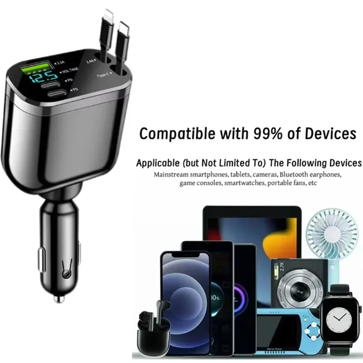Säg adjö till bristen på laddmöjligheter under bilresan. Den här kraftfulla 5-i-1 bil-laddaren är designad för att ge snabb och säker laddning till upp till fem enheter samtidigt – perfekt både för förare och passagerare. Med inbyggda utdragbara kablar (en Type-C och en Lightning) slipper du släpa med egna sladdar. Den passar i de flesta bilars cigarettuttag och är ett måste för familjer, samåkning eller långa resor.