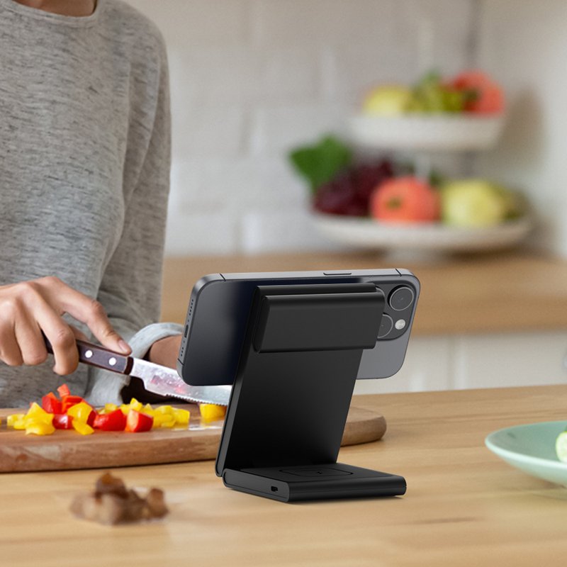 Den fällbara magnetiska trådlösa laddaren erbjuder en praktisk lösning för att ladda din iPhone, Apple AirPods och Apple Watch samtidigt. Med snabb laddning och modern teknik är detta en idealisk laddningsstation för både hemmet och resan.