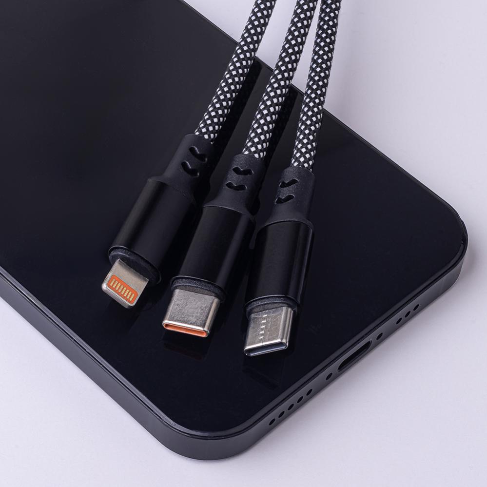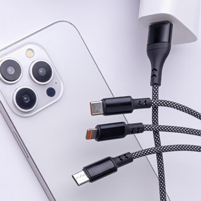 Allin1-kabeln erbjuder snabb laddning med upp till 66W effekt, vilket gör det möjligt att ladda tre enheter samtidigt – en perfekt lösning för dig som söker både effektivitet och bekvämlighet. Den slitstarka nylonflätan ger ökad hållbarhet och motståndskraft mot skador, medan dataöverföring via USB-C-kontakten säkerställer snabb och pålitlig filöverföring.