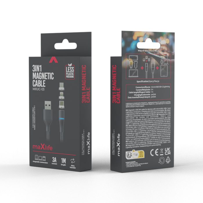 Med Maxlife MXUC-03 magnetiska kabel behöver du inte längre oroa dig för felaktig inmatning eller skador på din enhet. Upplev bekvämligheten och hållbarheten hos Maxlife och säkerställ en stabil anslutning för alla dina enheter.