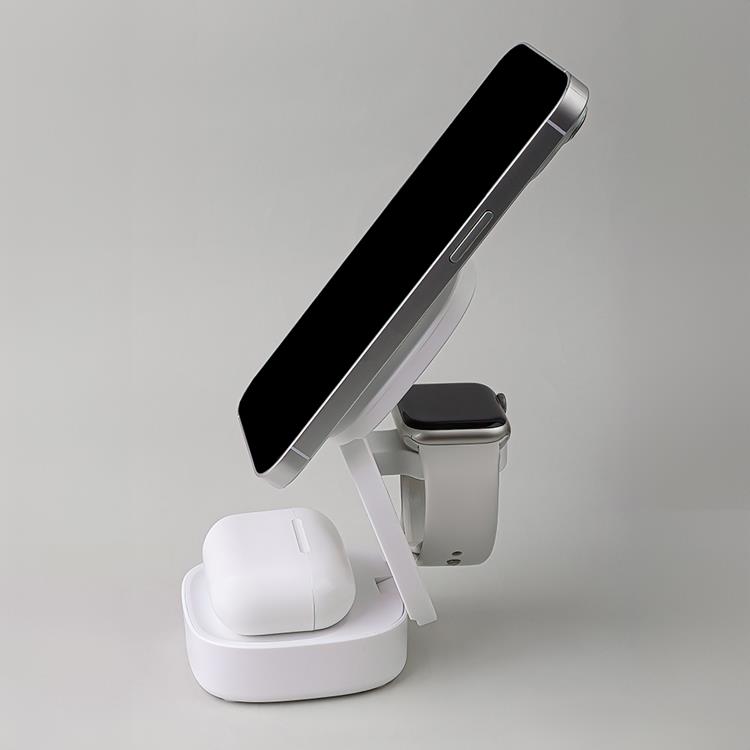 Denna laddare är kompatibel med MagSafe och alla telefoner som stöder trådlös laddning, och erbjuder snabb och problemfri laddning med upp till 15W effekt. De starka magneterna ser till att enheten sitter stadigt, vilket gör det möjligt att ladda tre enheter samtidigt – inklusive mobiltelefon, hörlurar och smartklocka.