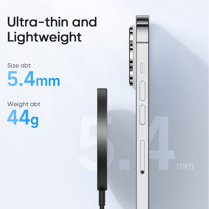 Den trådlösa laddningsplattan är designad för att vara både ultratunn och lätt. Med en tjocklek på endast 5.4 mm och en vikt på 44 g är den enkel att ta med sig. Den erbjuder snabb och effektiv laddning för din iPhone, vilket gör den till en perfekt följeslagare för din vardag.