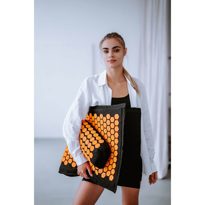 Efter en intensiv dag full av utmaningar och aktiviteter kommer den långsträckta, svarta och orange akupressurmattan att bli din oas av avkoppling. Föreställ dig att sträcka ut dig på den, njuta av det extra utrymmet och djupa avslappningen. Mattan kommer med en ergonomisk kudde och en praktisk förvaringsväska. Perfekt för träning, en resa och avkoppling i trädgården.