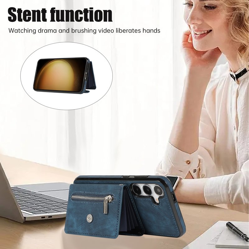 - Multi-slot korthållare med dragkedja och tryckknapp för säker förvaring av kort, kontanter och mynt.
