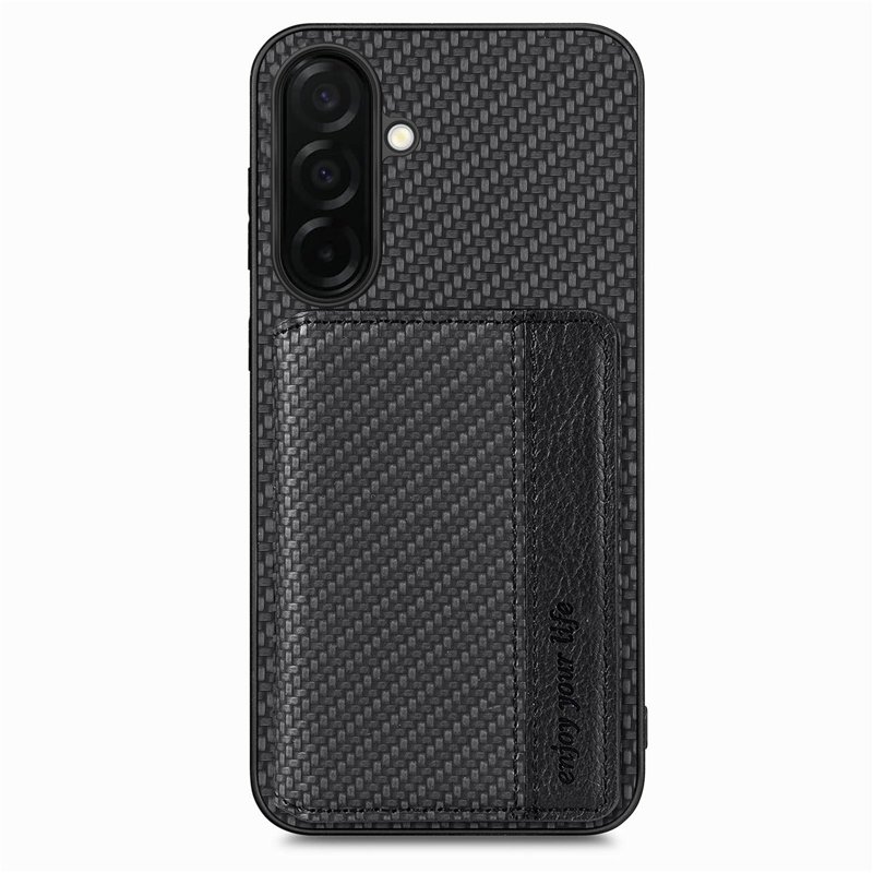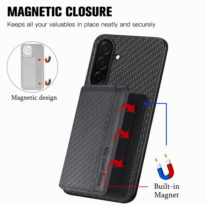Skydda din Samsung Galaxy S26 Plus med ett högkvalitativt fodral som kombinerar stil och funktionalitet. Detta RFID-blockerande fodral i kolfiberläder erbjuder både säkerhet och bekvämlighet. Med en praktisk kortficka och kickstand-funktion får du en produkt som gör din vardag enklare och mer organiserad.
