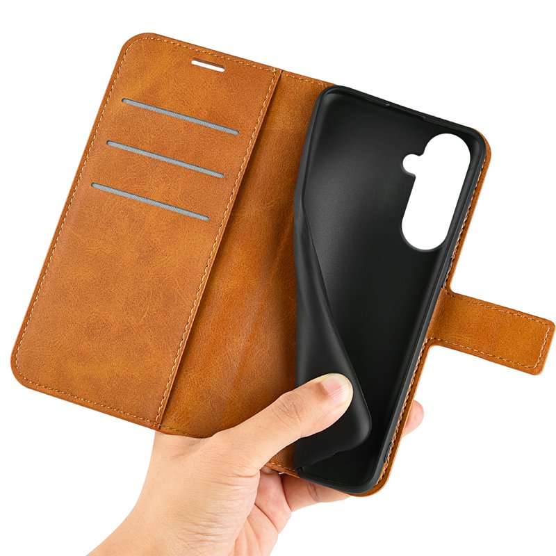 Skydda din Samsung Galaxy S26 Plus med detta eleganta och funktionella fodral i kalvskinnsstruktur. Det erbjuder 360-graders skydd mot repor och stötar. Med sin smarta plånboksdesign kan du enkelt förvara kort och kontanter. Fodralet är perfekt för både arbete och nöje.