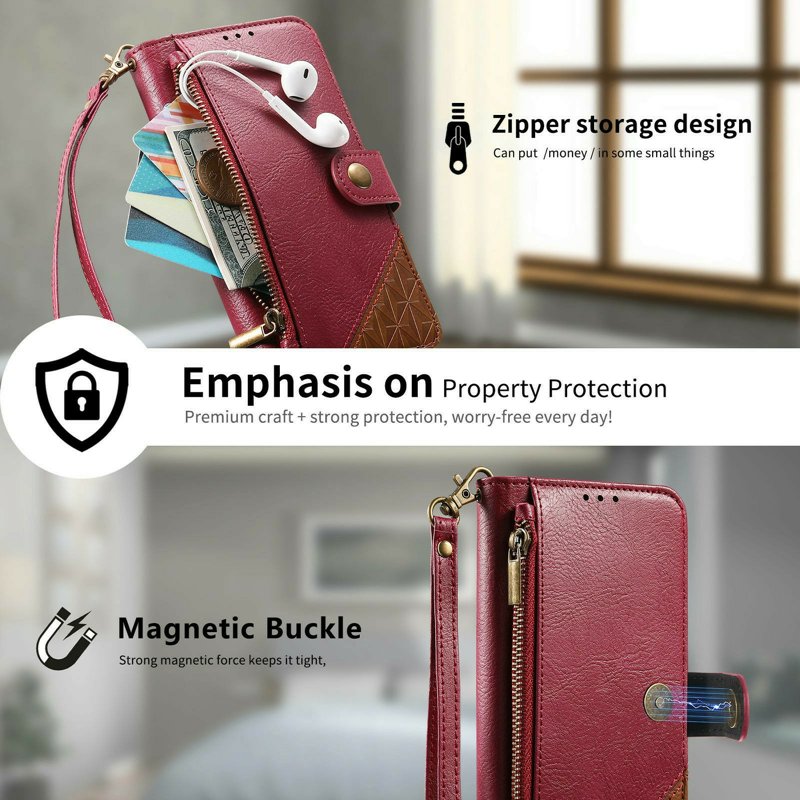 - Omfattande plånboksdesign - Inkluderar kortfack, en ficka för kontanter och en ytterficka med dragkedja för mynt och nödvändigheter.