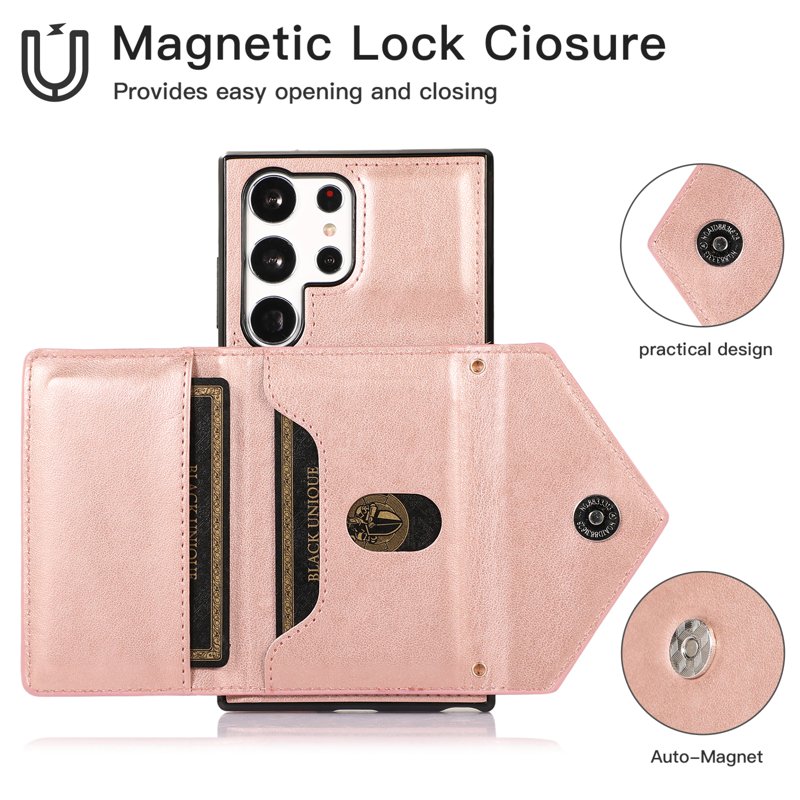 - Praktisk kortficka: Fällbara kortfack med magnetisk stängning för säker förvaring av kreditkort och kontanter.