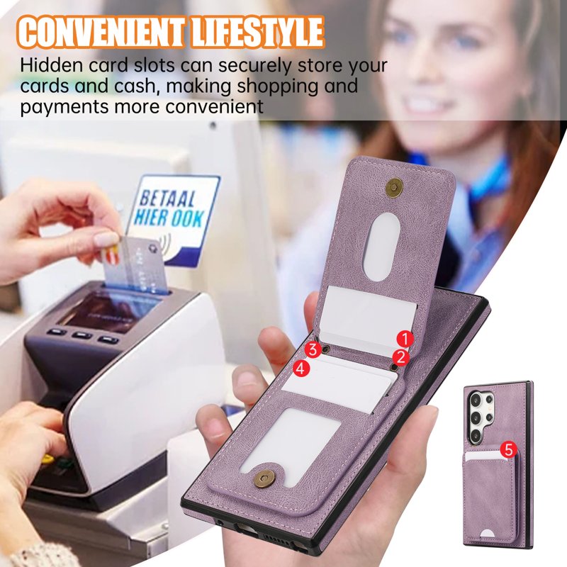 Skydda din Samsung Galaxy S26 Ultra med detta eleganta och funktionella fodral. Med en smart design som kombinerar en kortplats och kickstand, erbjuder detta fodral både stil och praktisk användning. Håll dina kort och kontanter organiserade och njut av bekväm handsfree-användning.