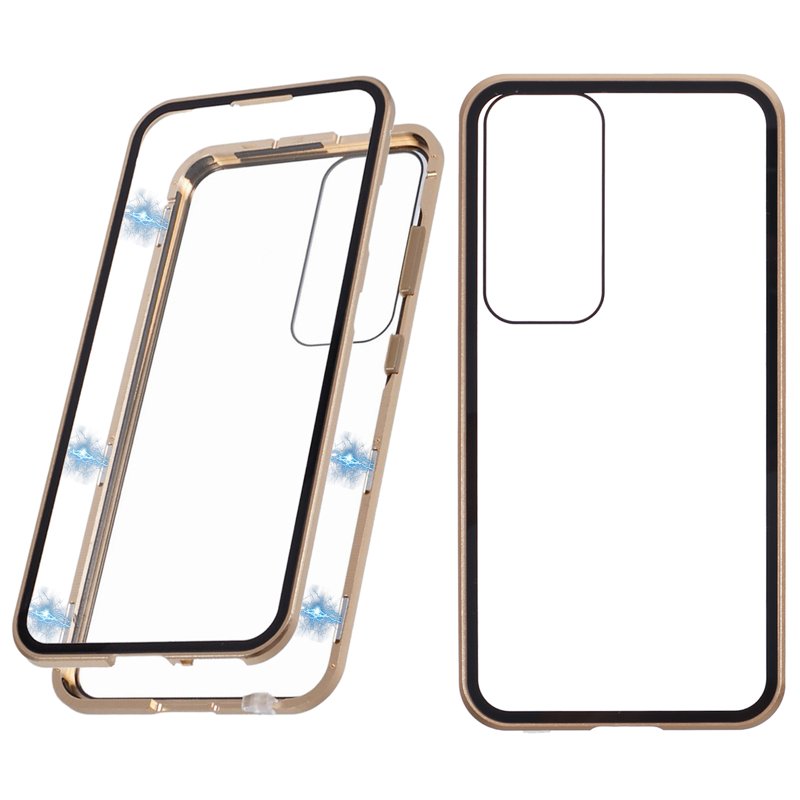 Skydda din Samsung Galaxy S26 Plus med detta dubbelsidiga härdade glasfodral. Det eleganta guldiga fodralet erbjuder överlägsen skydd och stil. Med en magnetisk metallram får du både funktion och estetik. Detta fodral är utformat för att ge dig trygghet och bevara telefonens skönhet.