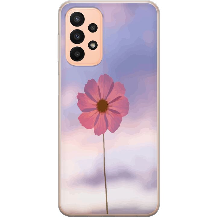 Ett genomskinligt mobilskal för Galaxy A23 5G med ett trendigt Rosa blomma tryck på baksidan. Skalet har en perfekt passform som skyddar din telefon mot repor, damm och smuts samtidigt som designen gör mobilen mer personlig.