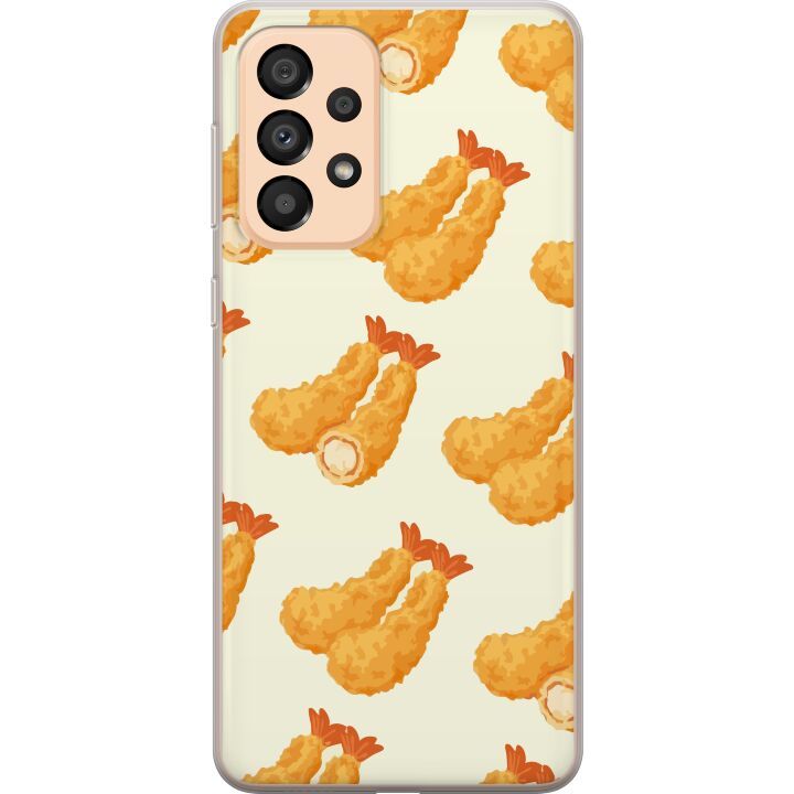 Ett genomskinligt mobilskal för Galaxy A33 5G med ett trendigt Räkor tryck på baksidan. Skalet har en perfekt passform som skyddar din telefon mot repor, damm och smuts samtidigt som designen gör mobilen mer personlig.