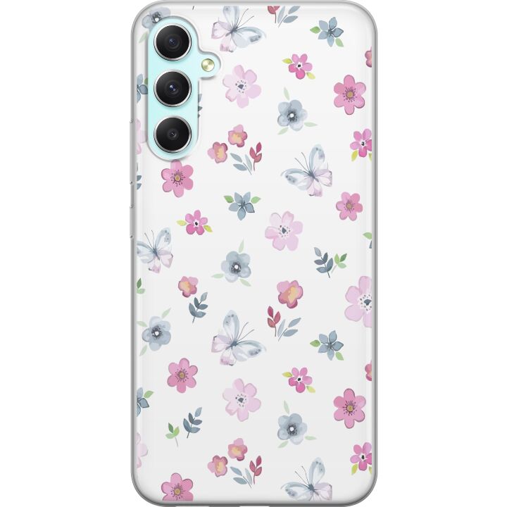 Ett genomskinligt mobilskal för Galaxy A34 med ett trendigt Blommor och fjärillar tryck på baksidan. Skalet har en perfekt passform som skyddar din telefon mot repor, damm och smuts samtidigt som designen gör mobilen mer personlig.