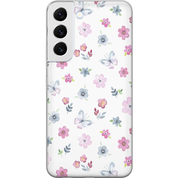 Ett genomskinligt mobilskal för Galaxy S22 5G med ett trendigt Blommor och fjärillar tryck på baksidan. Skalet har en perfekt passform som skyddar din telefon mot repor, damm och smuts samtidigt som designen gör mobilen mer personlig.