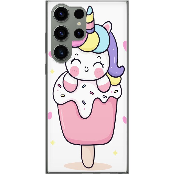 Ett genomskinligt mobilskal för Galaxy S23 Ultra med ett trendigt Glad enhörning tryck på baksidan. Skalet har en perfekt passform som skyddar din telefon mot repor, damm och smuts samtidigt som designen gör mobilen mer personlig.